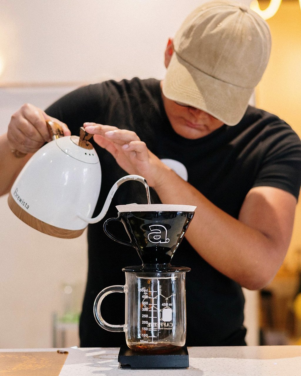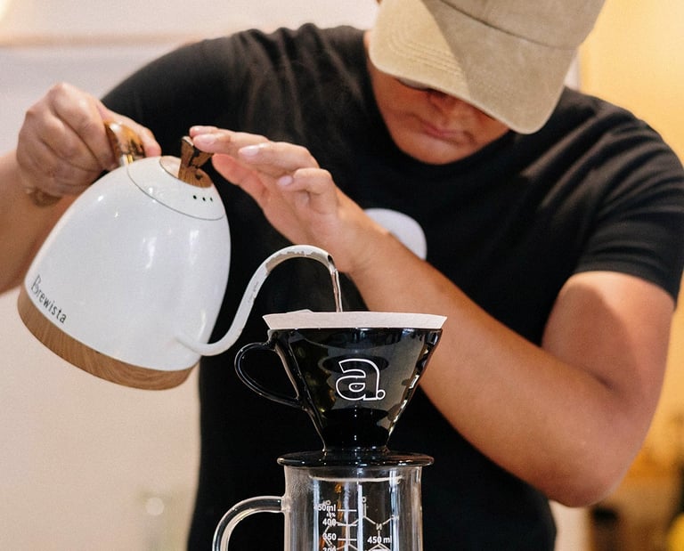 En la barra, el agua cae fina sobre el molido y libera notas que huelen a pan tostado, a cáscara cítrica, a flor después de lluvia. La loza tibia en las manos, el murmullo de la molienda, la luz de Atlixco entrando oblicua: todo está en su lugar para que el paladar lea mejor.